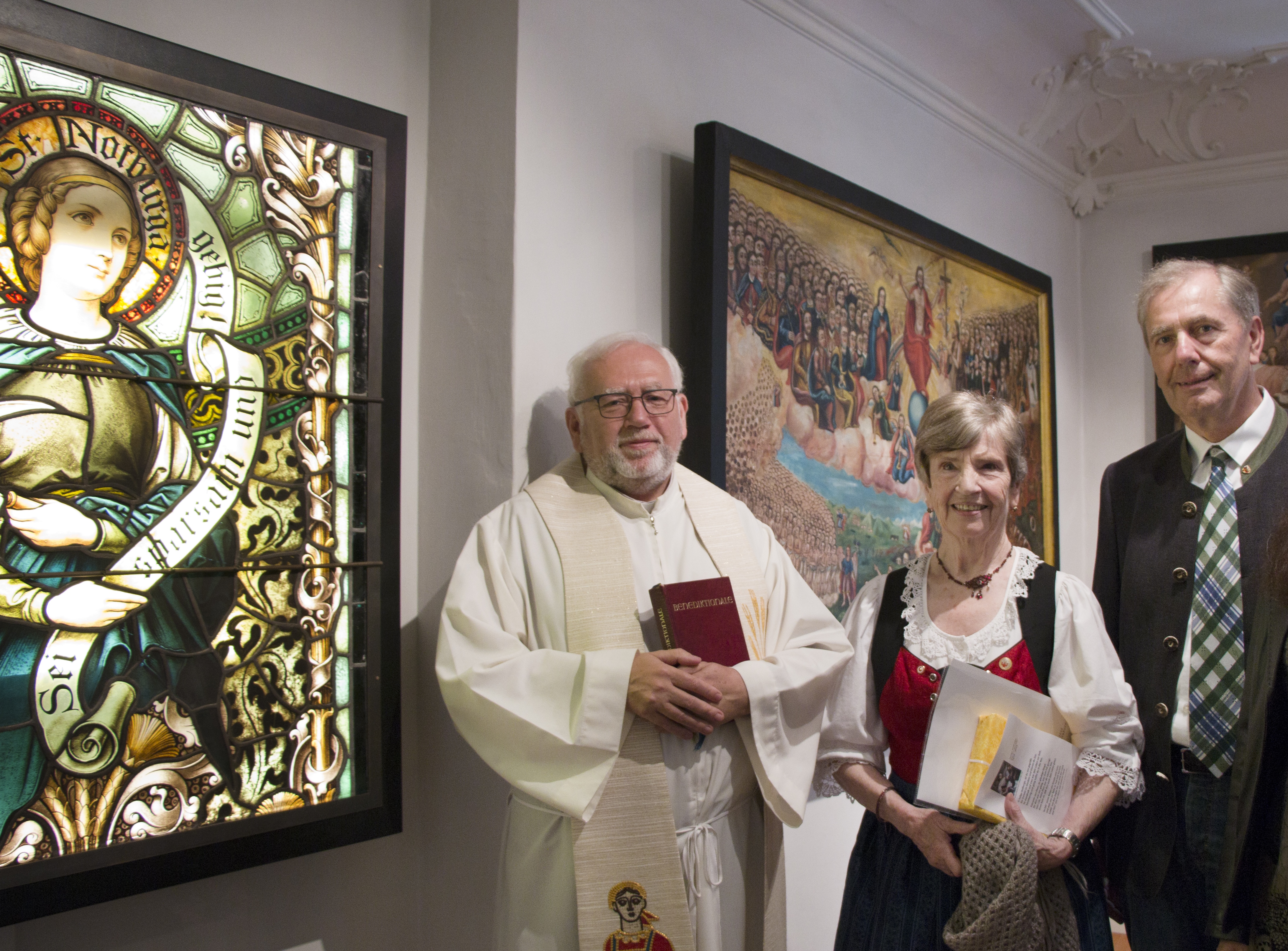 Dabei wurde der langjährigen Leiterin des Museums, Frau Traudl Hirschbrich, von kirchlicher Seite durch Pfarrer Henryk Goraus und von Gemeindeseite durch Bgm. Ing.Josef Hausberger herzlich gedankt. Als Höhepunkt wurde ein sehr schönes, restauriertes Kirchenfenster mit der Darstellung der Hl.Notburga, durch den Pfarrer von Eben gesegnet. Als Dauerleihgabe der Pfarre Serfaus ist dieses Werk der Tiroler Glasmalerei nun ein Schmuckstück im Notburga-Museum.